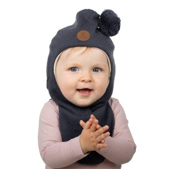 Soft and delicious balaclava hat with cute tassel on top. The hat warms the head and neck, and has windstops for the ears.