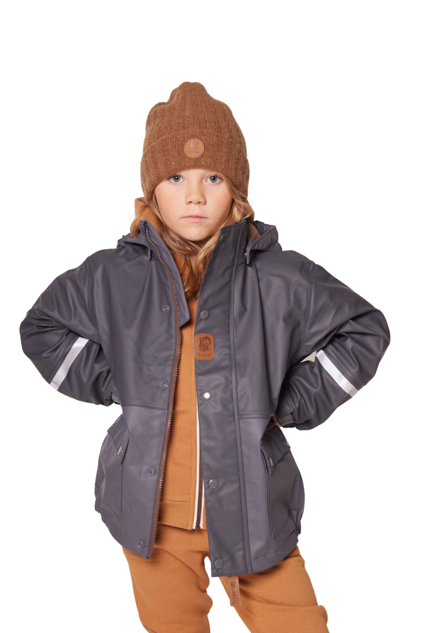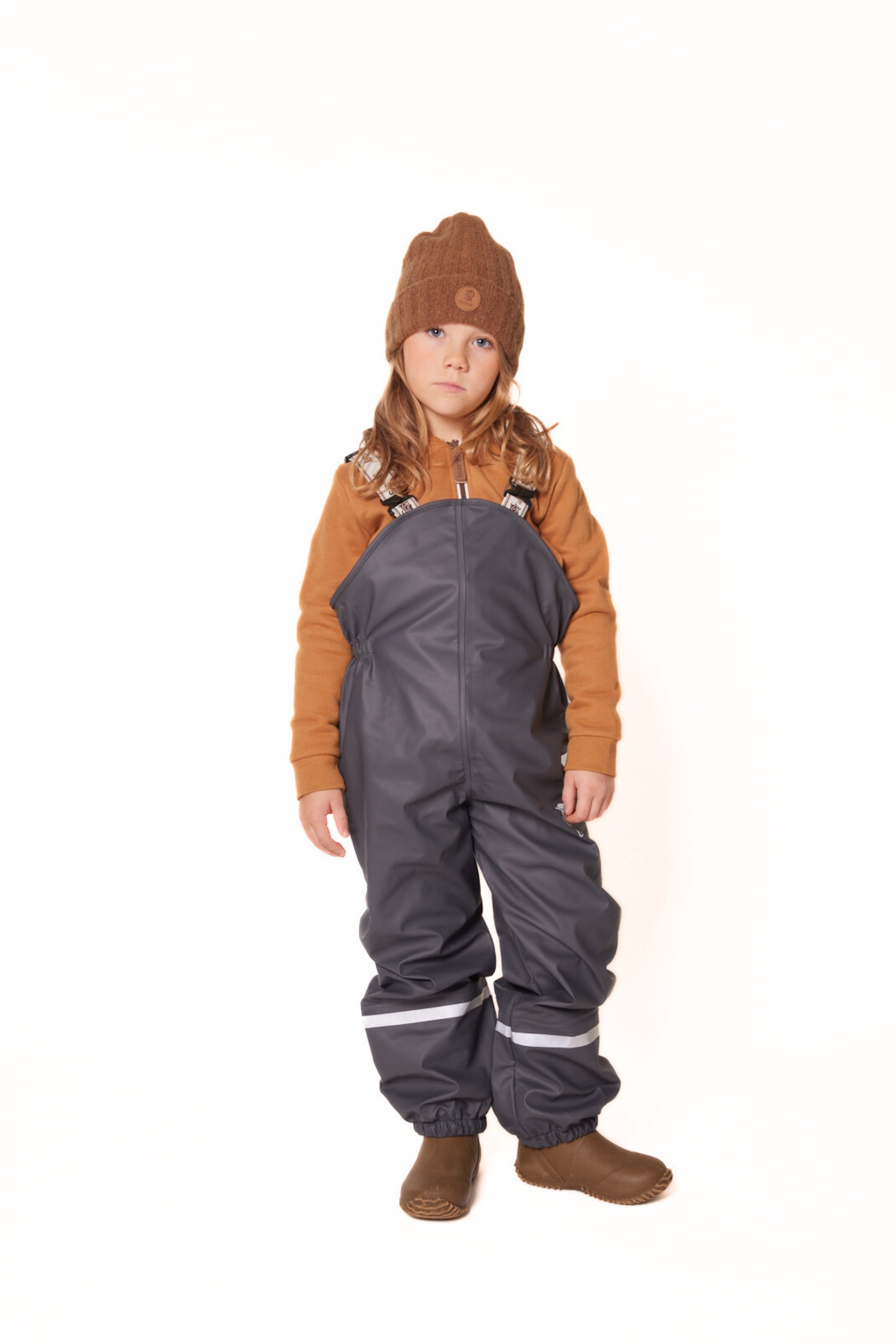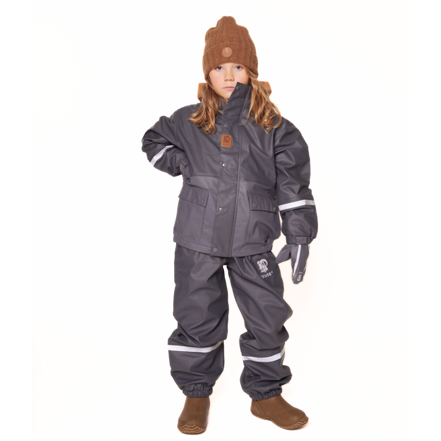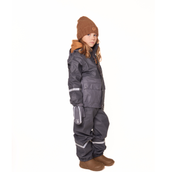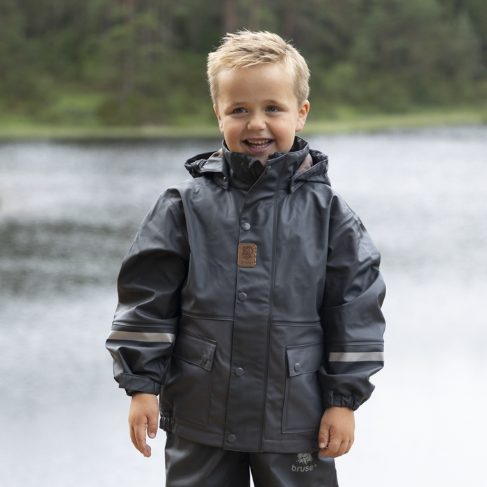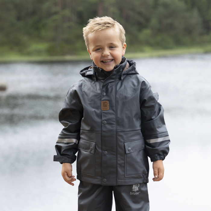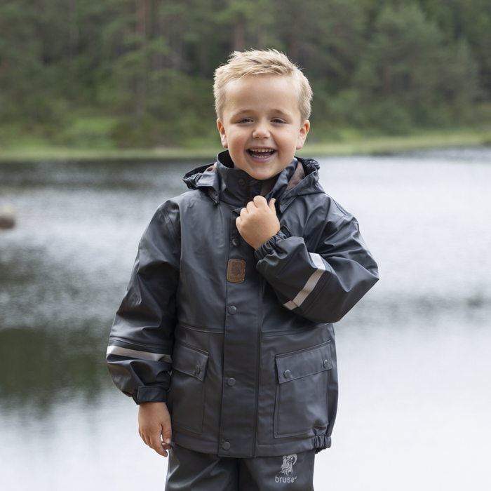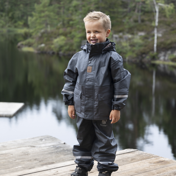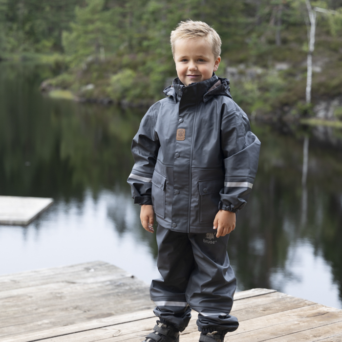 Bruse is a strong and durable rainwear set. The jacket has a removable hood, velcro tightening around the wrists and a protective bar above the zip. The trousers have a high waist with adjustable straps and velcro tightening at the waist. The durable and replaceable silicone straps, as well as regulation around the ankle, prevent the trousers from sliding up. We recommend using wool or synthetic material under waterproof garments. The set is produced with a focus on avoiding environmentally hazardous substances.