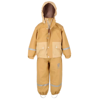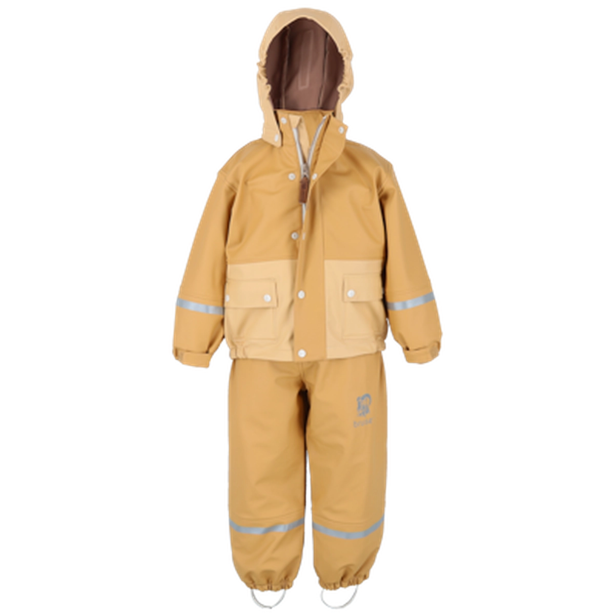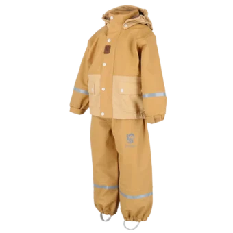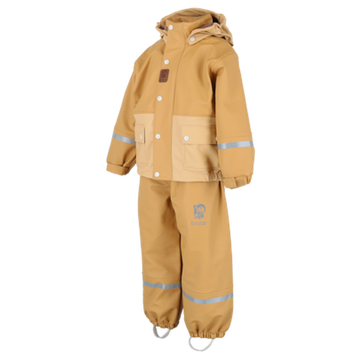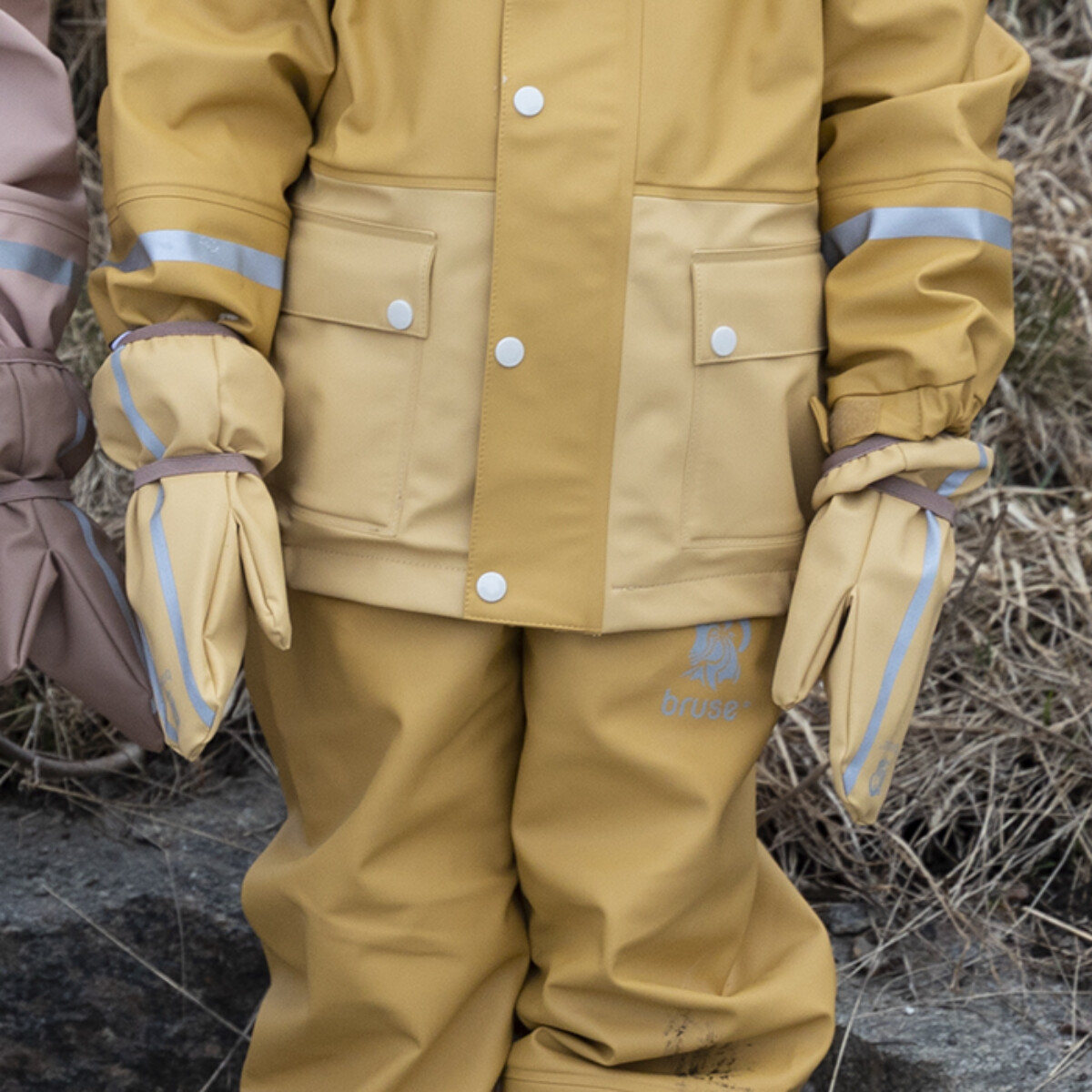 Bruse is a strong and durable rainwear set. The jacket has a removable hood, velcro tightening around the wrists and a protective bar above the zip. The trousers have a high waist with adjustable straps and velcro tightening at the waist. The durable and replaceable silicone straps, as well as regulation around the ankle, prevent the trousers from sliding up. We recommend using wool or synthetic material under waterproof garments. The set is produced with a focus on avoiding environmentally hazardous substances.