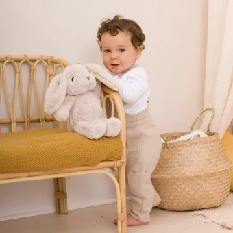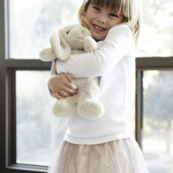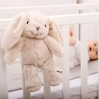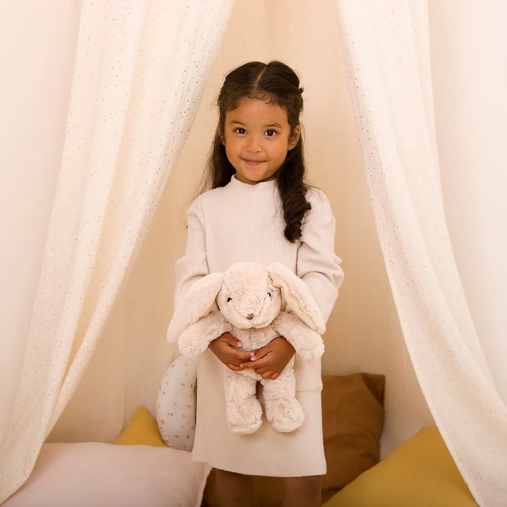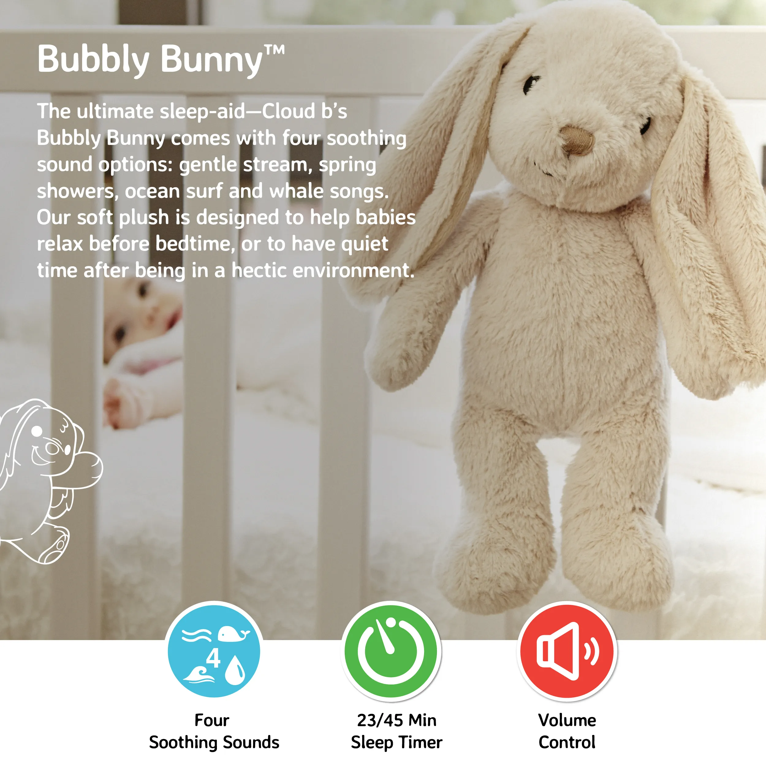 Bubbly Bunny bangsinn er hannaður fyrir börn jafnt sem fullorðna. Hann er hinn fullkomni svefnfélagi fyrir alla fjölskylduna sem hjálpar manni að komast í ró. Inni í bangsanum er lítið tæki sem spilar 4 róandi hljóð (smábarnafliss, vindgnauð, ölduhljóð og róandi lullaby) Þessi hljóð hafa mjög róandi áhrif og geta gert kraftaverk fyrir óróleg börn.