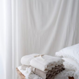 Dry flat. Do not iron. Tumble dryer can damage the fibers. We recommend washing in a linen washing bag to prevent puffing. After washing, the blanket should be shaped.