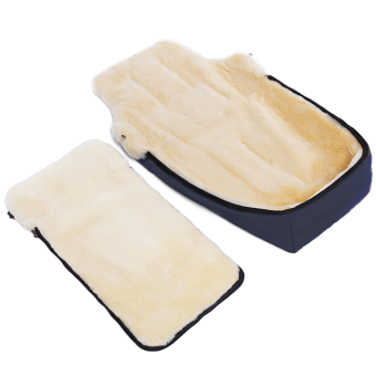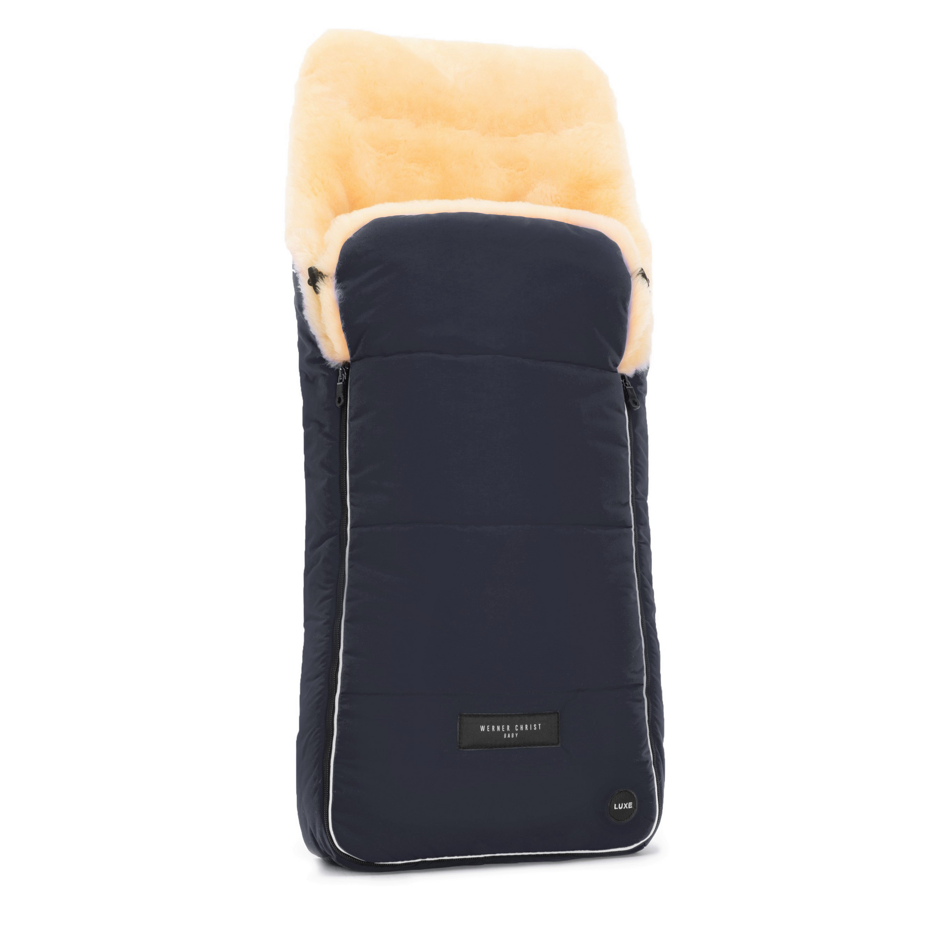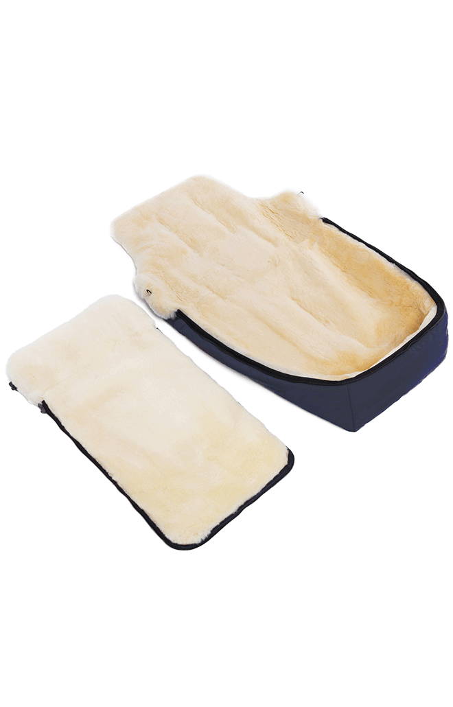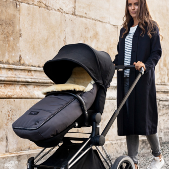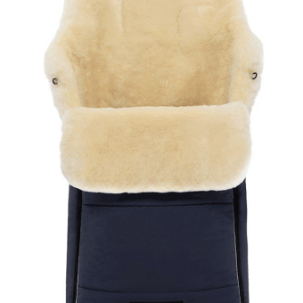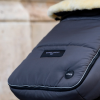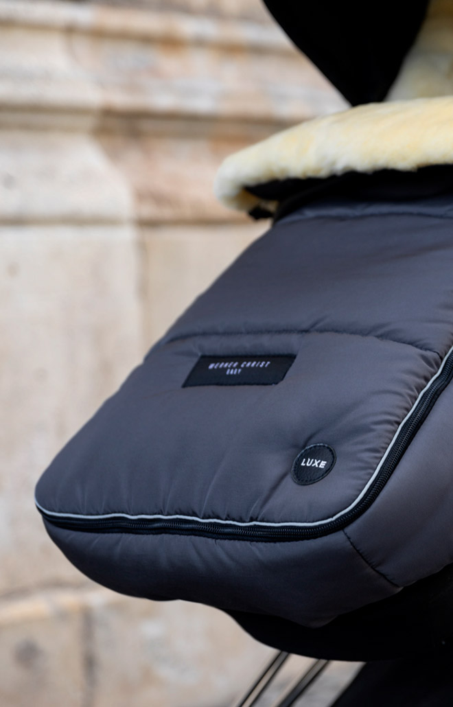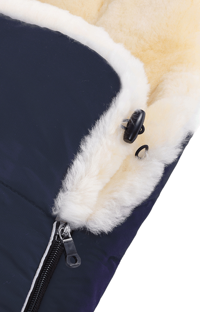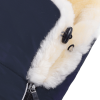 The premium counterpart to our Arosa footmuff is our AROSA LUXE lambskin footmuff. The lambskin inner part of the Arosa LUXE is processed with full fur and is therefore made entirely from whole skins. This is identified by an elegant, embroidered badge on the front. It is equipped with a separable two-way zipper. This processing allows the top and bottom parts to be completely separated on warmer days. The fur cover can be closed high and therefore protects your child from drafts.