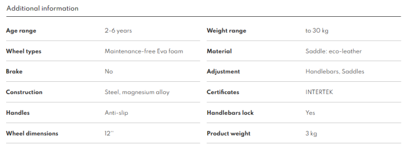 The handlebar grips are made of non-slip material and are protected against unintentional slipping of the hand. With the adjustable seat and handlebars, you can adjust the vehicle individually to your child’s needs. The lock to limit the steering angle eliminates the risk of tipping over, and the rounded edges protect little users’ skin from abrasions. The bicycle frame has a discreet embossing that serves as a footrest.