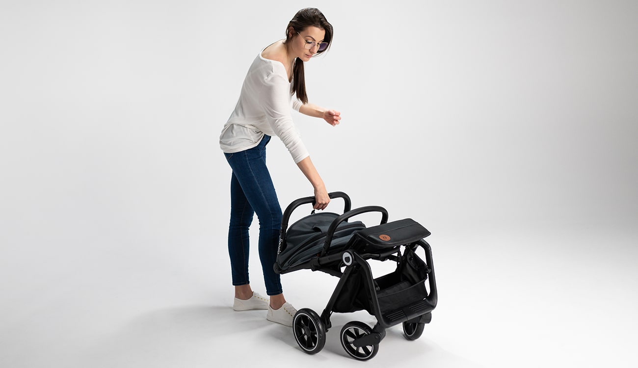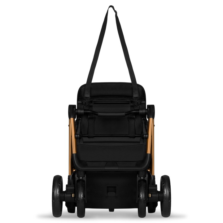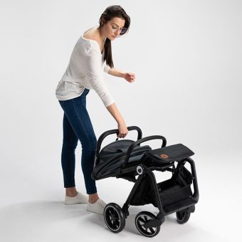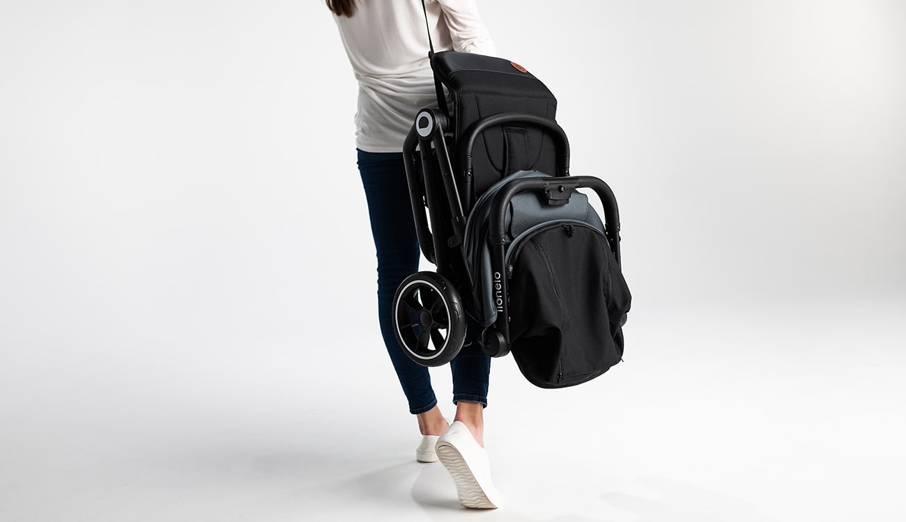 You can easily fold the Lionelo Cloe Black Onyx stroller with one hand. You can also use the auto-folding system – at the push of a button, the stroller will fold itself. You can easily fit it even in a small car trunk. The durable aluminum frame weighs only 8.2 kg. You can easily carry the stroller on your shoulder. With this in mind, we have included a special cover and belt.