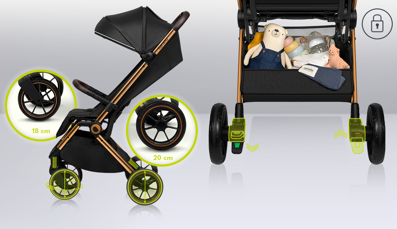 Discover our latest solution compact stroller on large wheels. At Lionelo, we aim to ensure that our strollers are equipped with all the amenities that will allow you and your baby to travel comfortably in a variety of places and on a variety of surfaces. That’s why the Lionelo Cloe Black Onyx stroller will work well not only when strolling in your favorite park, but also when shopping in a crowded city center or traveling.