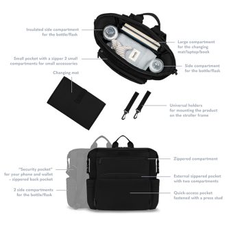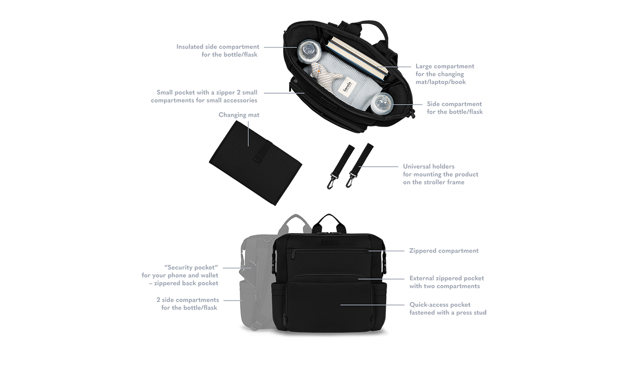 The Lionelo Cube backpack has been sewn from sturdy neoprene, which waterproof properties work well in changing weather. What’s more, the material is easy to clean. Dirt comes off after wiping with a damp cloth, and if you want to freshen things up, you can throw the backpack in the washing machine. The 12 functional pockets include a thermal bottle compartment and a security pocket for documents. It’s a great gift idea for parents-to-be – the backpack, packed in a decorative box, is ready to be gifted.