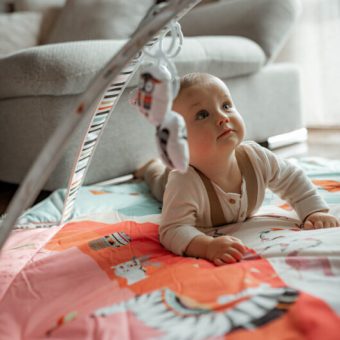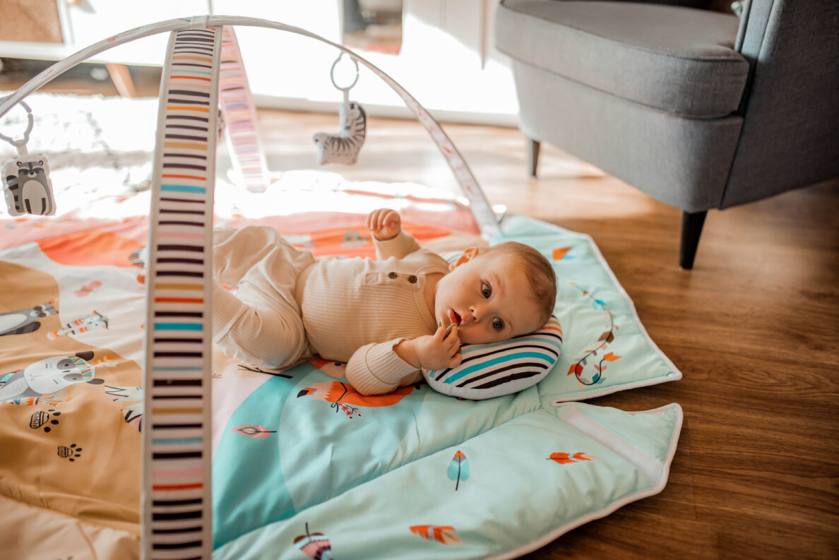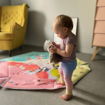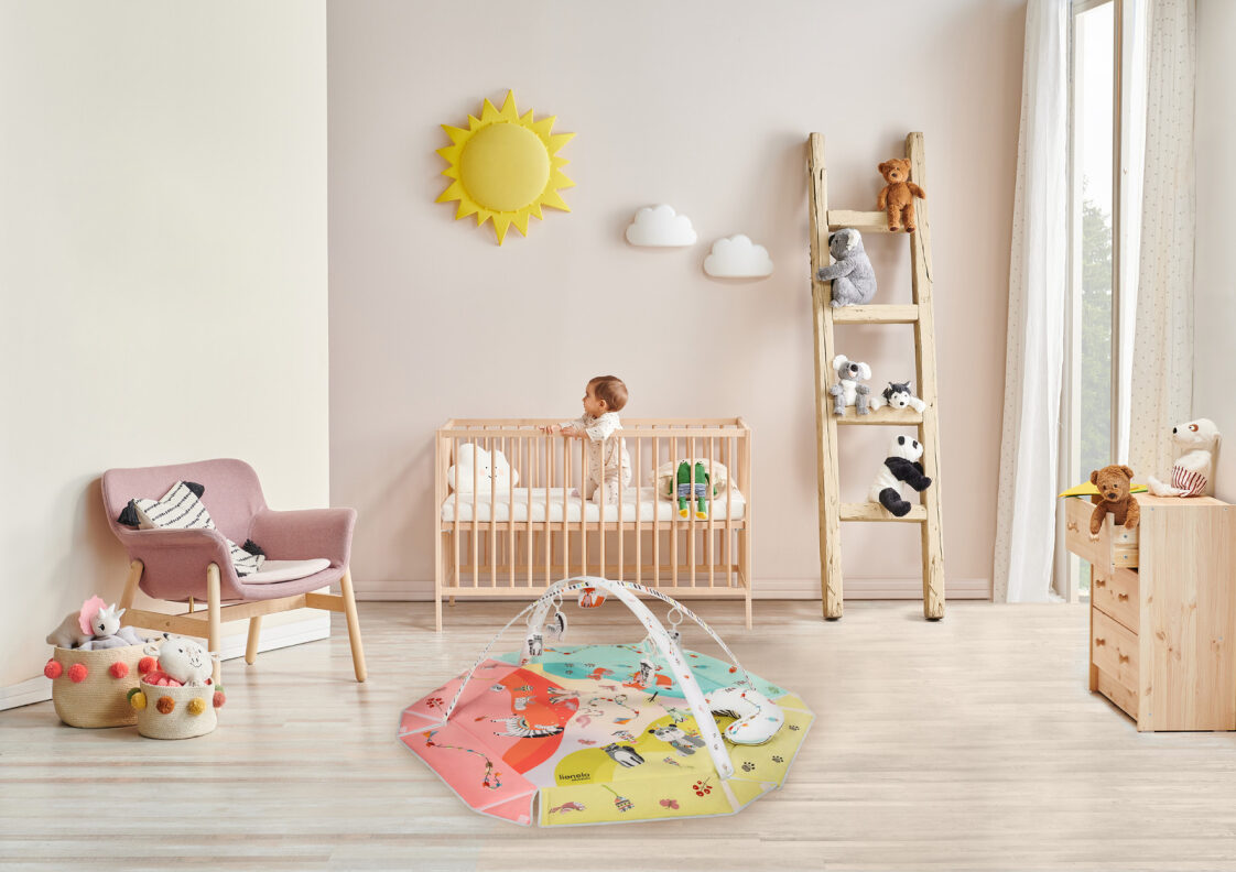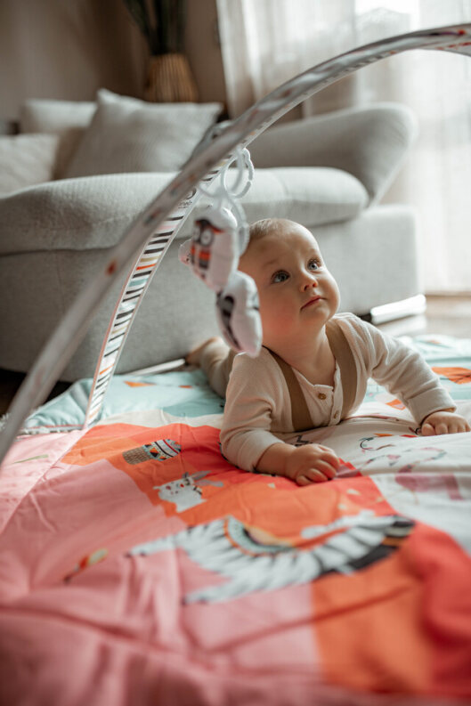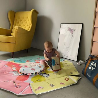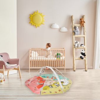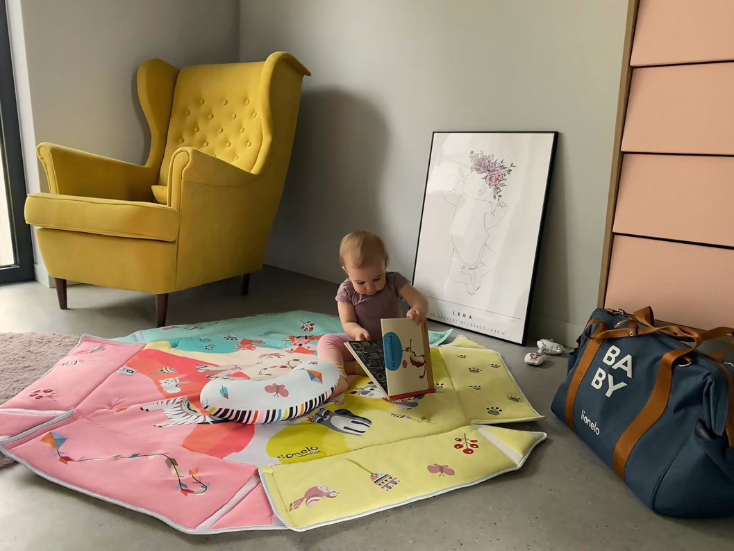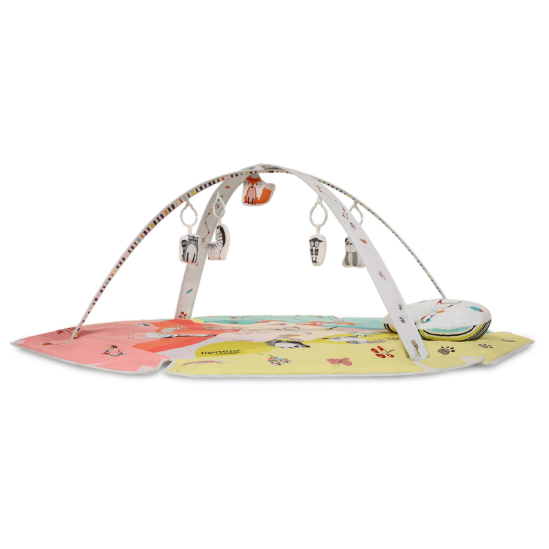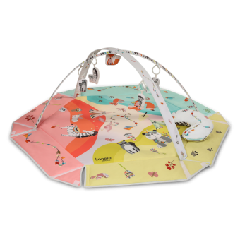 Vivid colours and friendly and aesthetic design of Jenny playmat aim to develop the child’s imagination and concentration skill. Interactive toys attached to toy bars, once pushed, make different sounds. The set also includes Tummy Time cushion for lying down on the belly. Lionelo Jenny playmat was made of a soft material resistant to abrasion. The product can be hand-washed at a temperature up to 30°C.