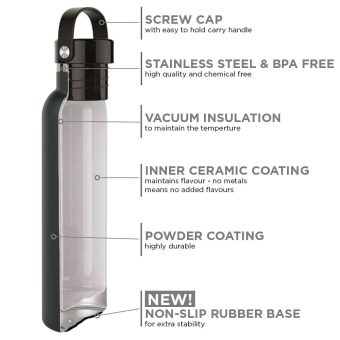 THE SECRET IS ON THE INSIDE – much more than your average reusable bottle! Made with a ceramic coating, the Runbott will not only maintain the temperature of your favourite drink, it will also maintain the flavour.