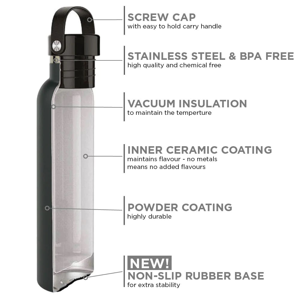 The special coating inside a Runbott bottle ensures you enjoy only the original flavours of your drink – no exposed metal inside the bottle means no nasty and unpleasant metallic tastes. - VACUUM INSULATION