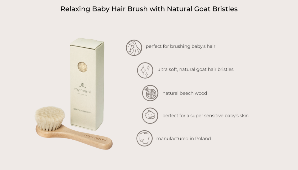 The brush is perfect for daily care of the baby’s sensitive skin. Very soft goat hair allows the baby to additionally relax and calm down.