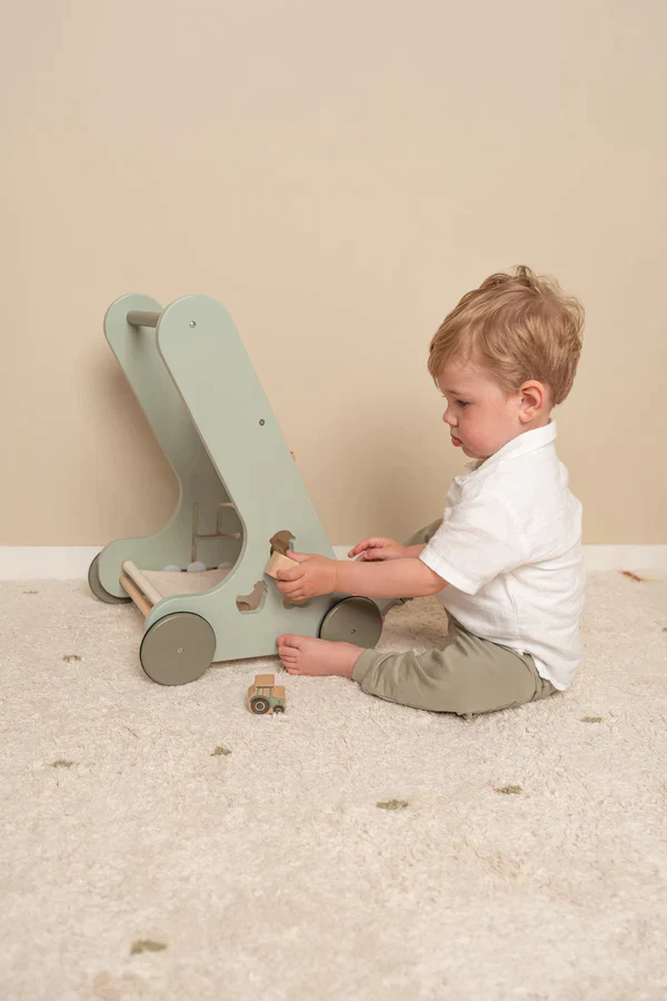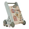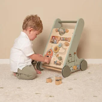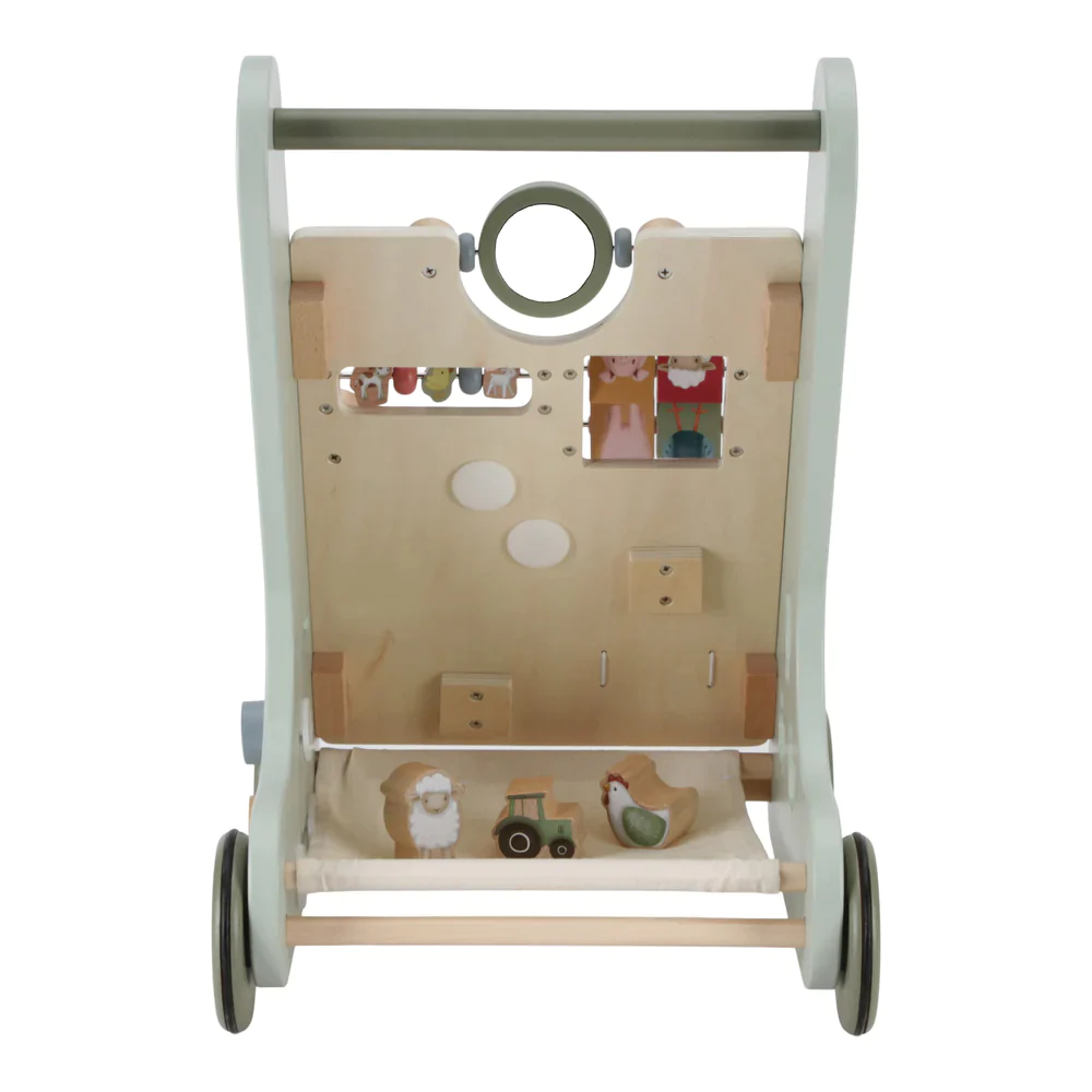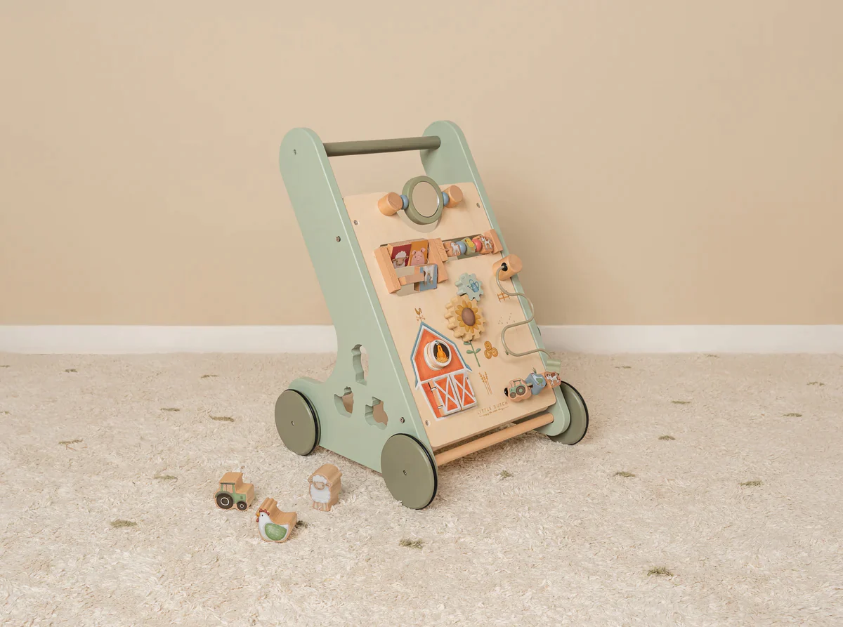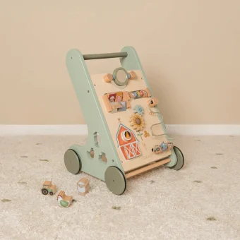 Walk, play and learn! This wooden activity walker offers various challenging activities that support the development of your child’s motor skills. Challenge your baby with the many activities on this beautifully decorated walker. There are 8 activities to discover and master, like completing the animals in the barn by turning the blocks. With its sturdy design, the walker is suitable for children of 12 months and older who are ready for their first steps. Prepare for enthusiastic encouragement as your little one moves easily through the house with this walker. The rubber wheels ensure that your floor does not get scratched. Adult assembly required.