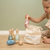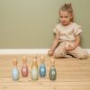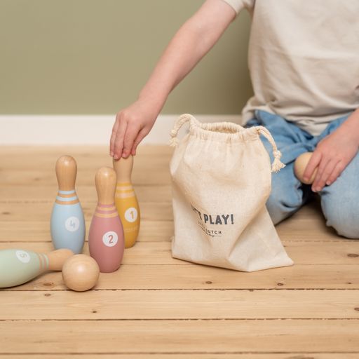 This playful game helps your little one develop hand-eye coordination by rolling the ball and aiming for the pins. The 6 wooden pins each have their own number to encourage beginning counting skills. The set comes with two wooden balls and a cotton bag to store the bowling game set dry and safely. Do not leave outside or in the rain when finished playing.