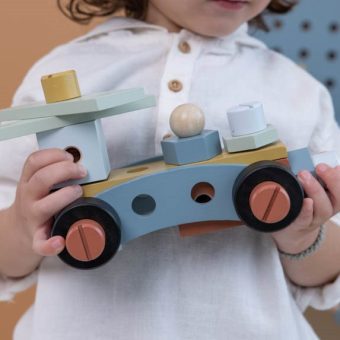 Viðar smíðabekkur og stillanlegt áhaldabelti með viðar verkfærum fyrir litla smiði. – Inniheldur m.a. hamar, skrúfjárn, skrúfur og bolta.