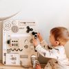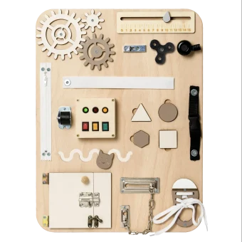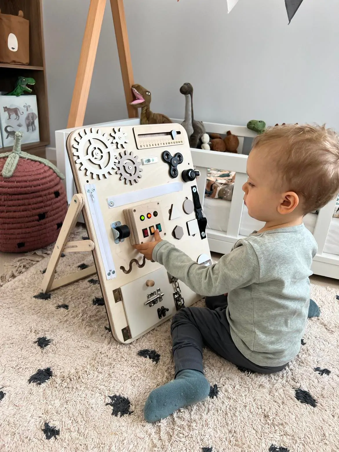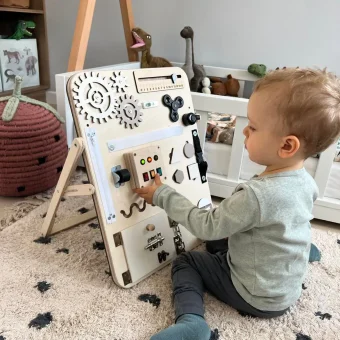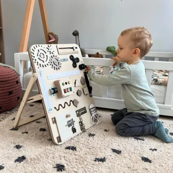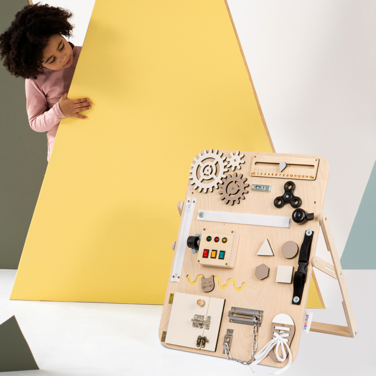 The ENJOY activity board is the best combination of small size and a large number of engaging elements! Thanks to its compact size, you can easily carry it and even take it with you on holiday – we guarantee that it will work better than a whole bag of toys. In this model, we focused on the elements that children and parents appreciated the most in our boards, but we also introduced several novelties: fidget spinner, and maze with a cat.