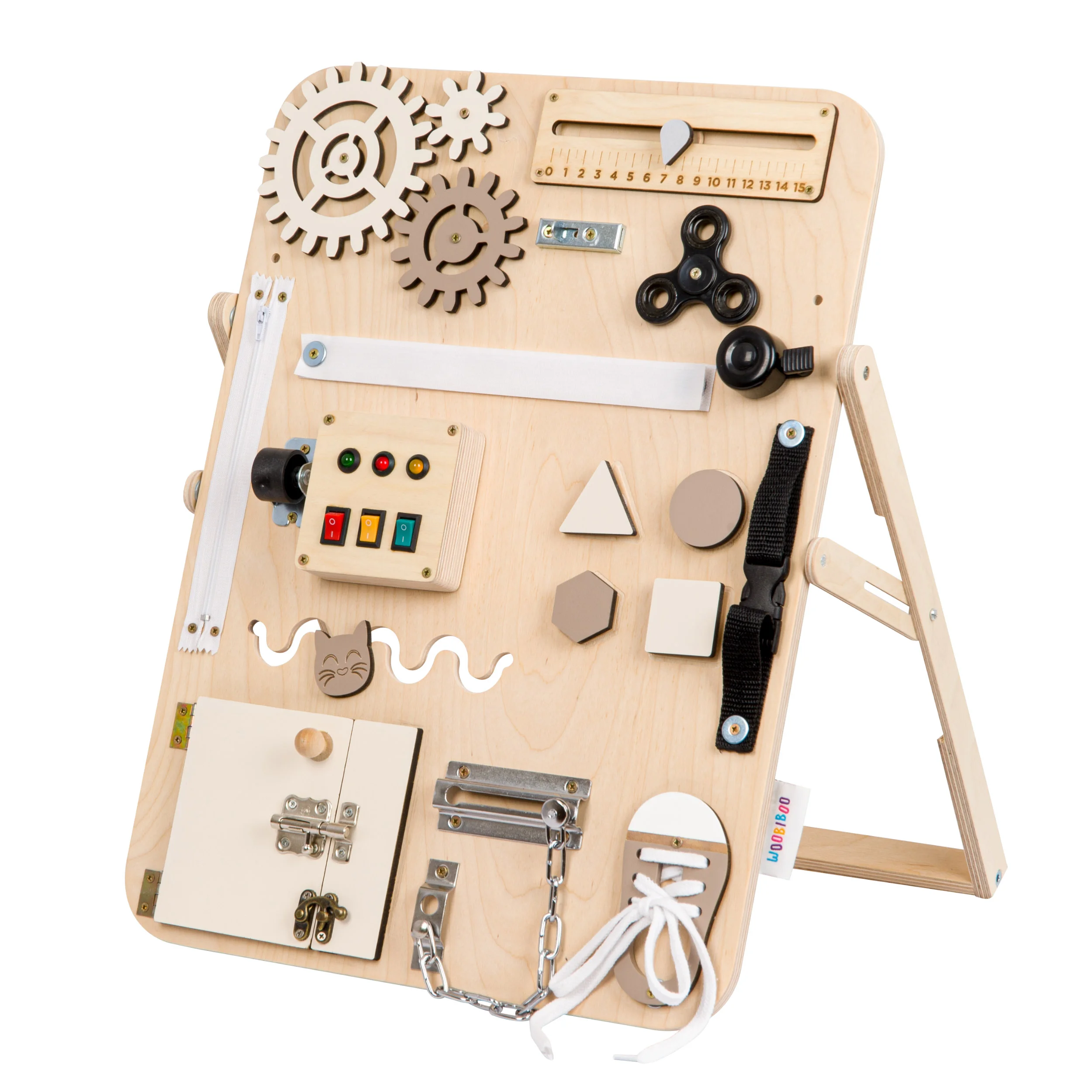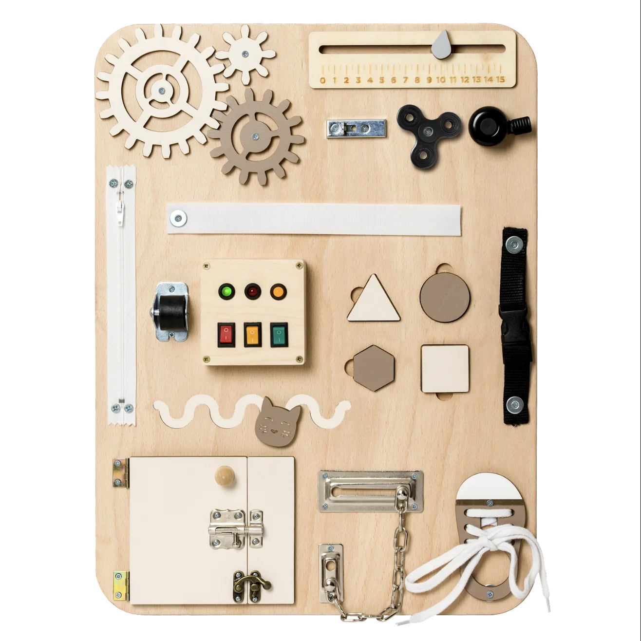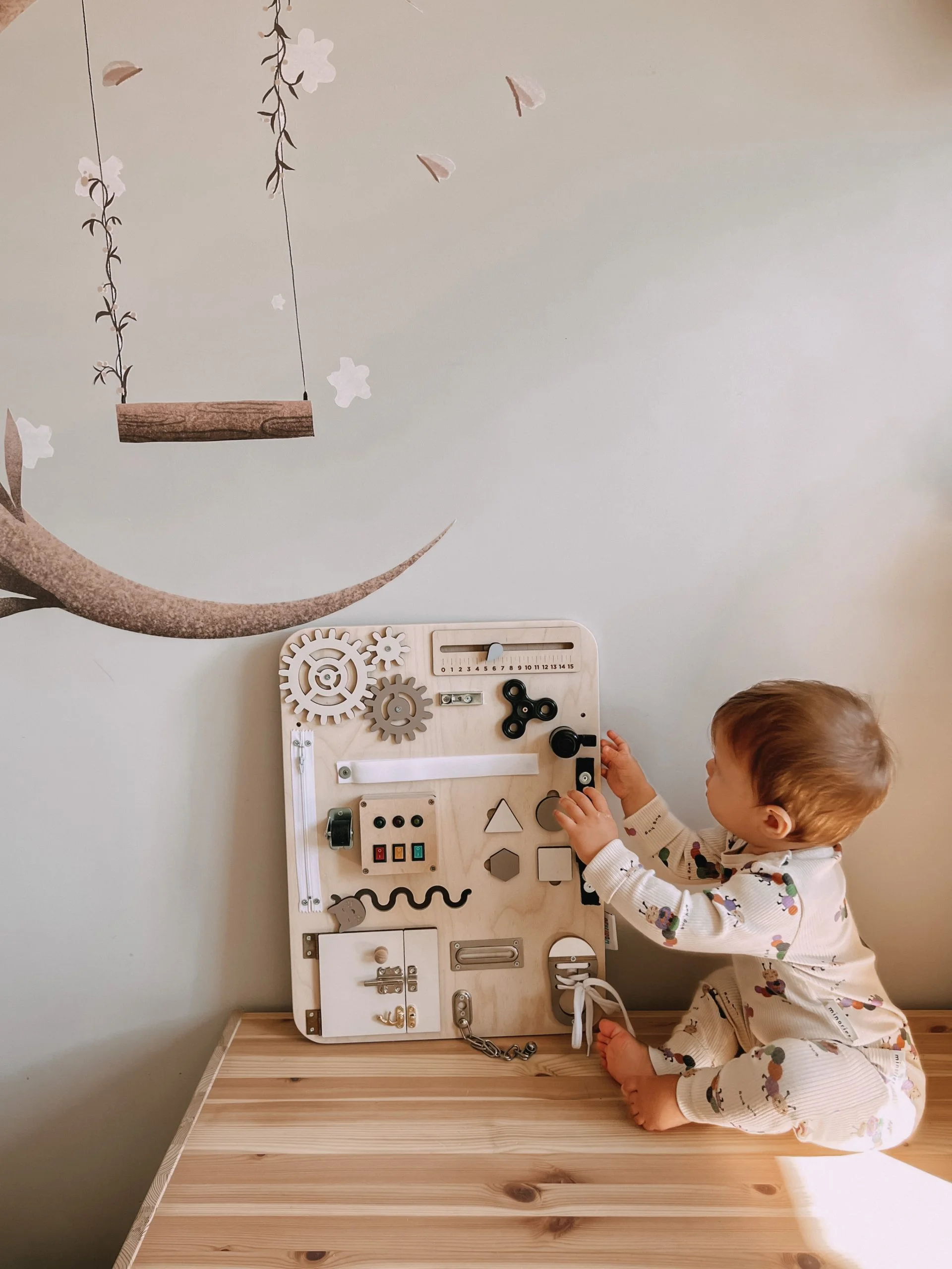 The ENJOY activity board is the best combination of small size and a large number of engaging elements! Thanks to its compact size, you can easily carry it and even take it with you on holiday – we guarantee that it will work better than a whole bag of toys. In this model, we focused on the elements that children and parents appreciated the most in our boards, but we also introduced several novelties: fidget spinner, and maze with a cat.