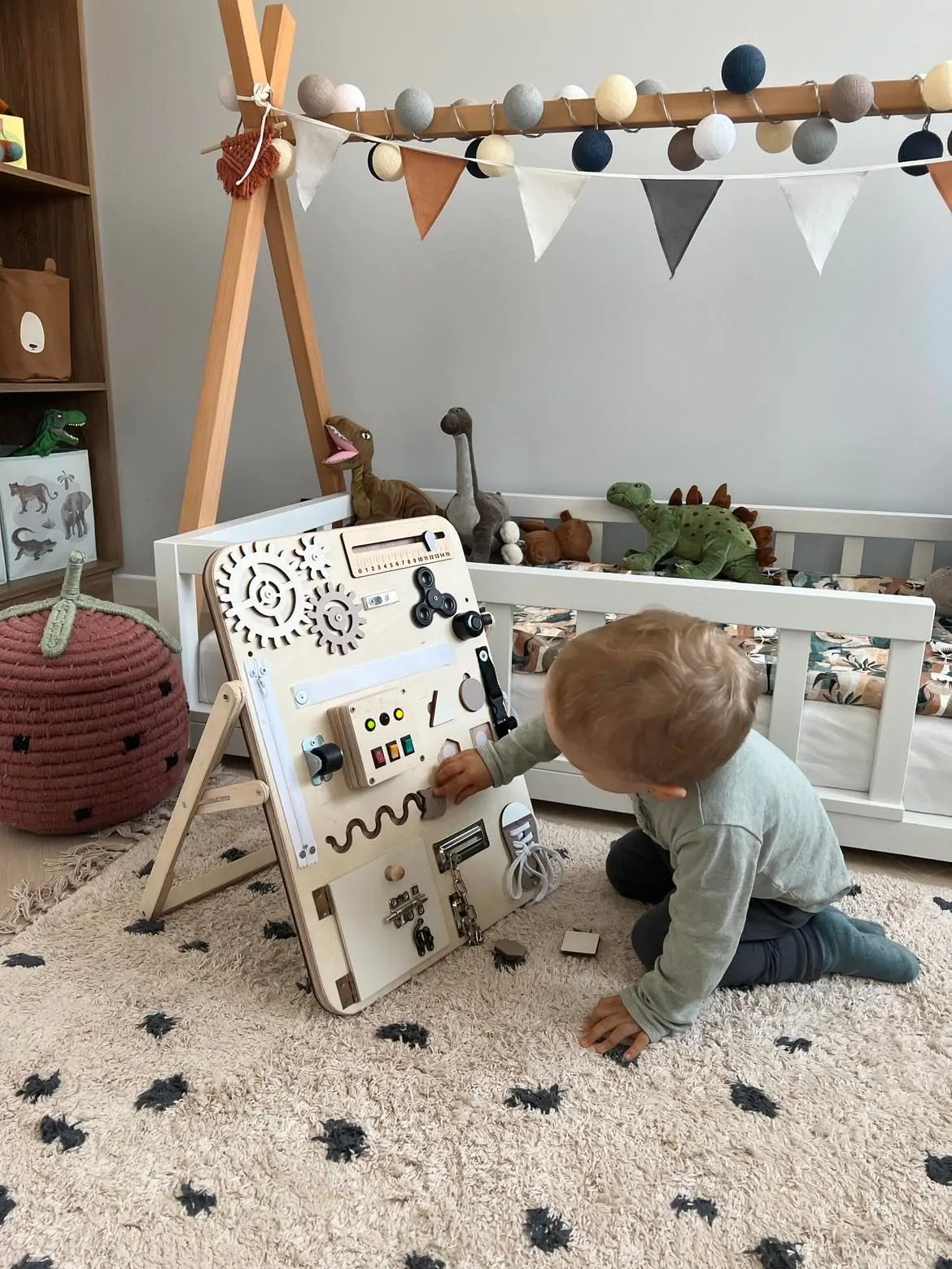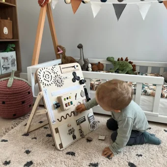 The ENJOY activity board is not just another toy that your child will get bored with after a few minutes of play. On the contrary! It will engage them for loooong hours, giving you a moment of peace and relaxation! All the elements of our most compact whiteboard support the child’s development and teach patience in exploring the world. It is a timeless educational toy that will work at various stages of toddler’s development. Little explorers return to it after a month or a year and get to know the individual elements anew.