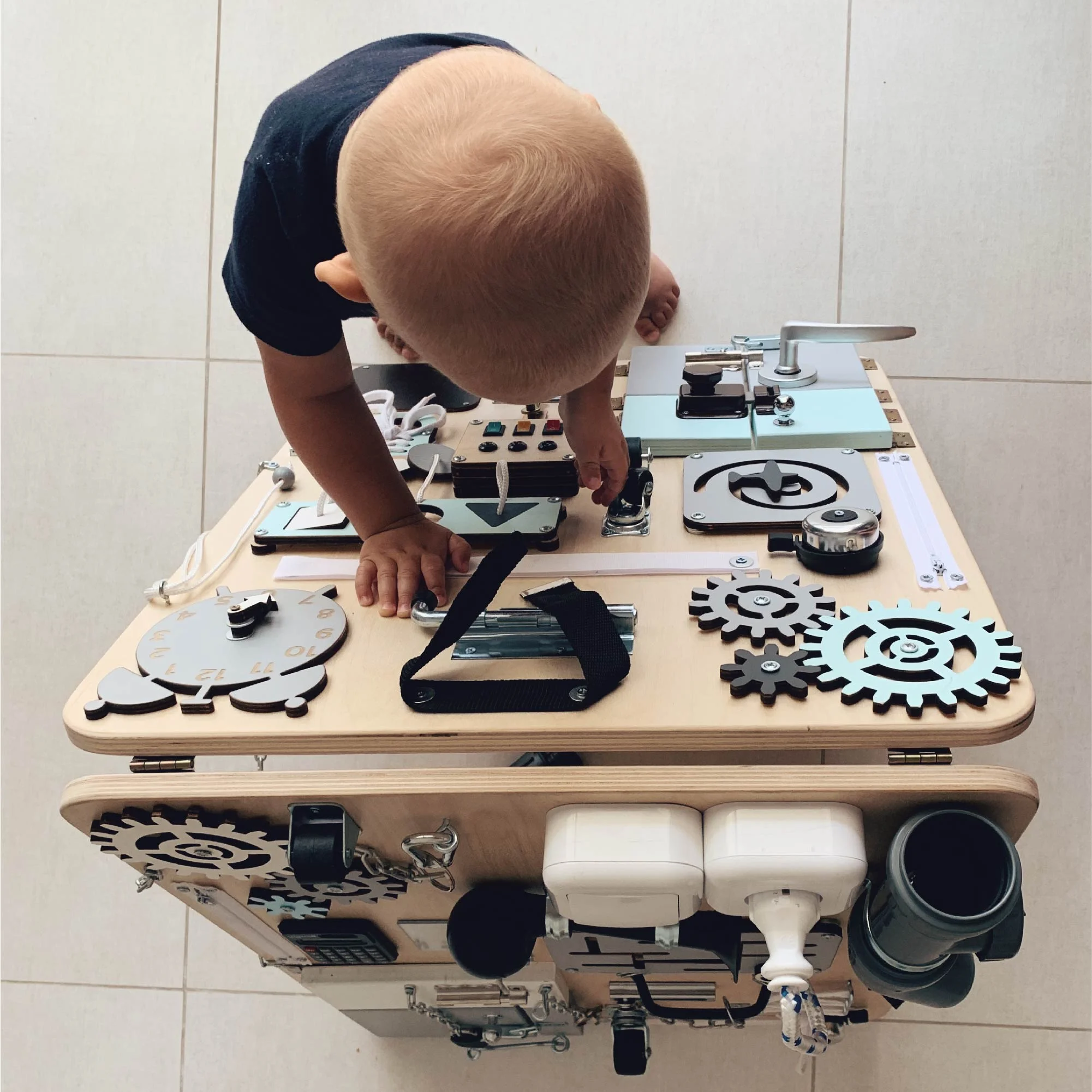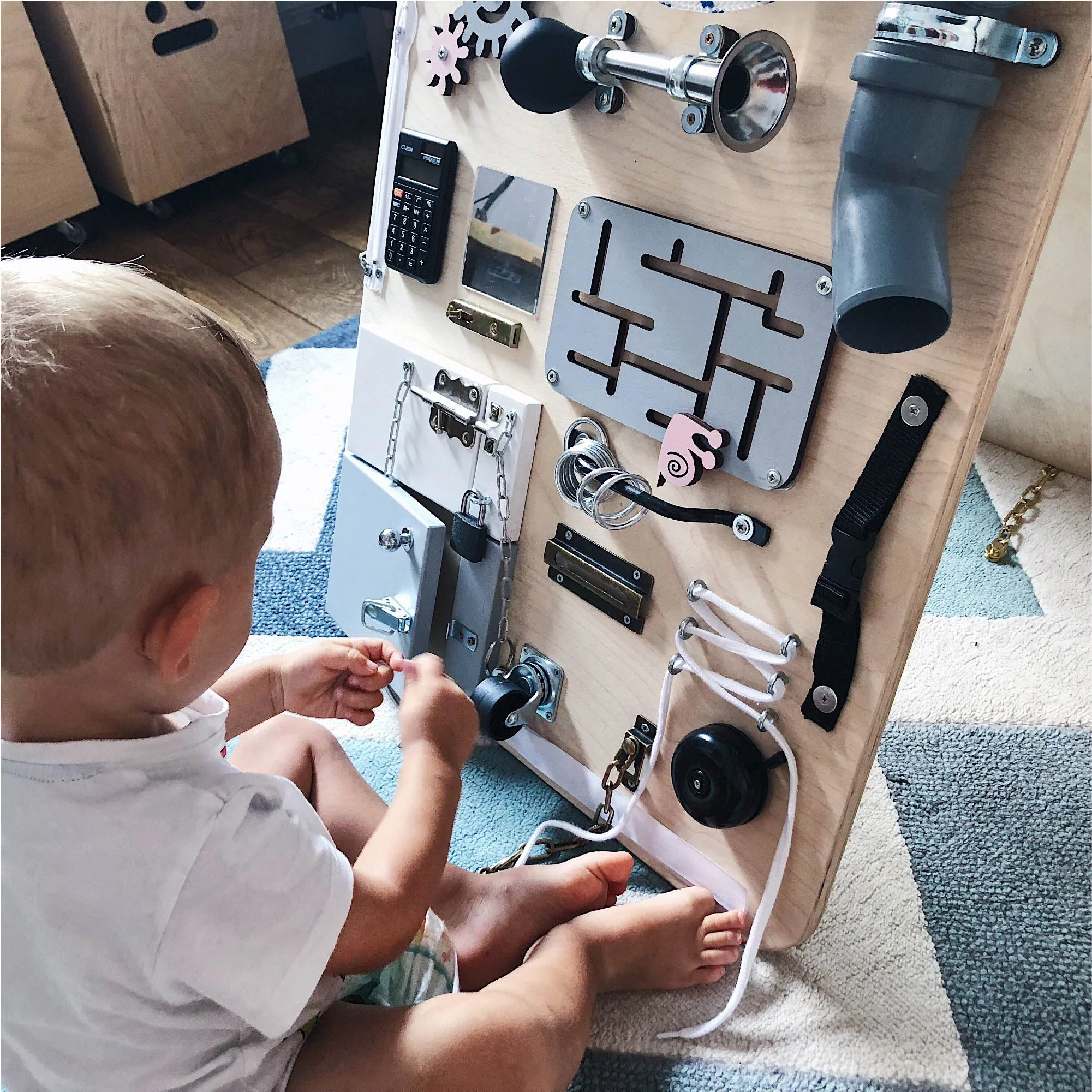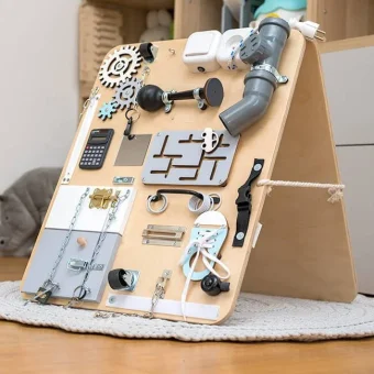 The activity board is standing and double-sided, which means that it is perfect for two children playing. The sensory board consists of many elements that the child develops – the toddler has the opportunity to explore the world by touching new objects. The double handling board is the most extensive and portable model – it can be folded and taken with you even on vacation. They consist of various components: - Beads;